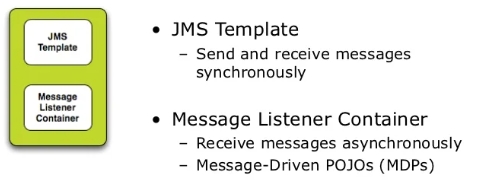 비동기: MessageListenerContainer를 사용하여 비동기 방식으로 큐나 토픽의 메세지에 반응하는 간단한 자바 객체인 메세지 구동(Message-Drive) POJO(MDP) 를 사용하여 메세지를 받는데 사용합니다.
