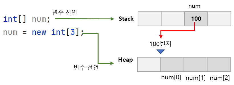 동일한 자료형을 그룹(묶음)으로 저장하는 것으로 생성 시점에 크기를 지정해야 하며 크기가 지정 되면 변경 될 수 없습니다. 배열도 Stack에 저장 되므로 초기화 후 사용 해야 합니다. ( 배열 객체를 생성 해야 한다는 의미 입니다. ) 1. 배열 선언 : 자료형[] 변수명; 2. 배열 객체 생성 : 배열 참조 변수은 Stack에 저장 되고 실제 데이터는 Heap에 저장 됩니다.