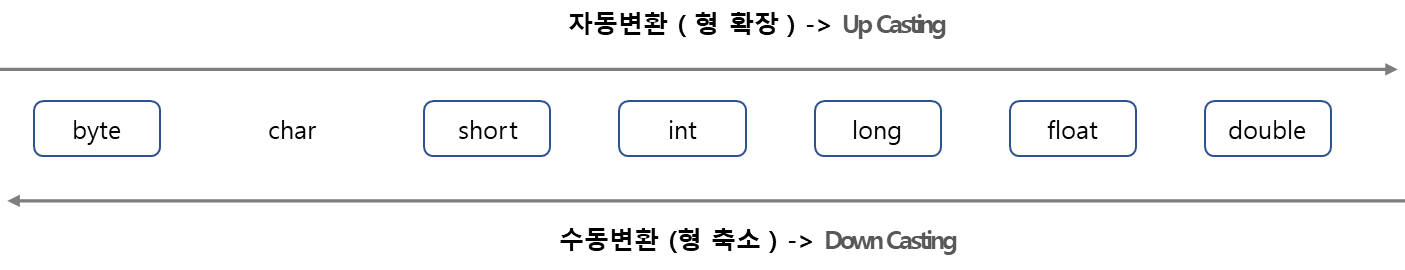 Up Casting : 자료형 크기가 큰 쪽, 범위가 넓은 쪽으로 자동 변환되는 것을 형 확장이라고 하며 자동 변환되는 것이며. 범위 안에 있는 경우 자동 Casting 됩니다.