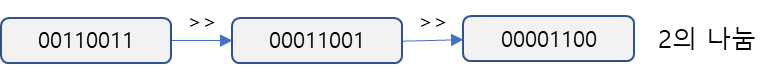 | >> | 부호를 유지하면서 지정한 수만큼 비트를 전부 오른쪽으로 이동시킴. (right shift 연산) |