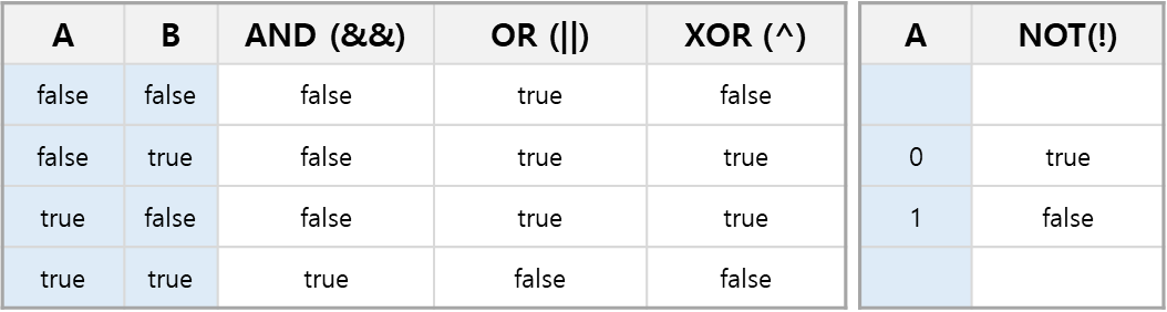 논리 연산자는 주어진 논리식을 판단하여, 참(true)과 거짓(false)을 결정하는 연산자로 피연산자로 boolean ( true/false )만 올 수 있고 결과는 boolean type입니다.