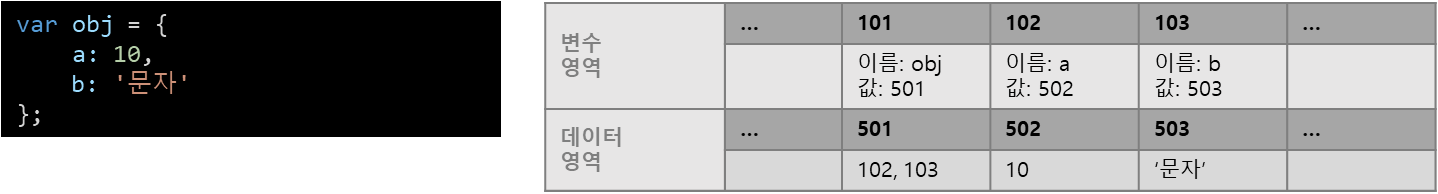 - 변수 obj : 변수 영역 101번지 ( 501 ) , 데이터 영역 501번지 ( 102, 103 )