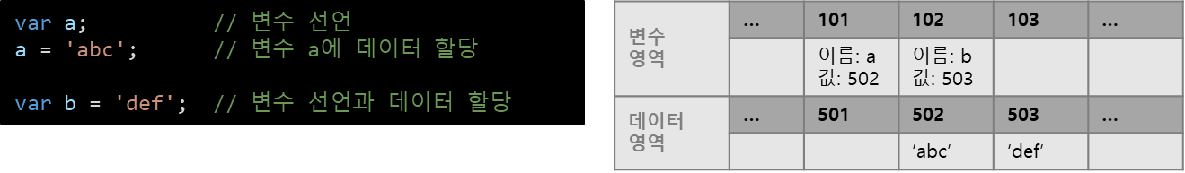 - 'abc' 값은 메모리의 데이터 영역을 스캔하여서 값이 저장된 곳이 없으므로 임의의 주소 502번지에 할당(저장) 되고 그 주소를 변수 a의 주소 101번지의 값[502]으로 저장합니다. - var b = 'def' : 변수 a와 동일한 방법으로 메모리에서 관리됩니다.