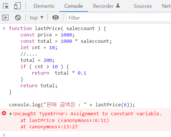 function lastPrice( saleccount ) { const price = 1000; const total = 1000 * saleccount; let cnt = 0 // ... 많은 줄수 cnt = cnt + 20 // ... 많은 줄수 if ( cnt > 10 ) { return total * 0.1 } return total; } console.log("판매 금액은 : " + lastPrice(6)); |