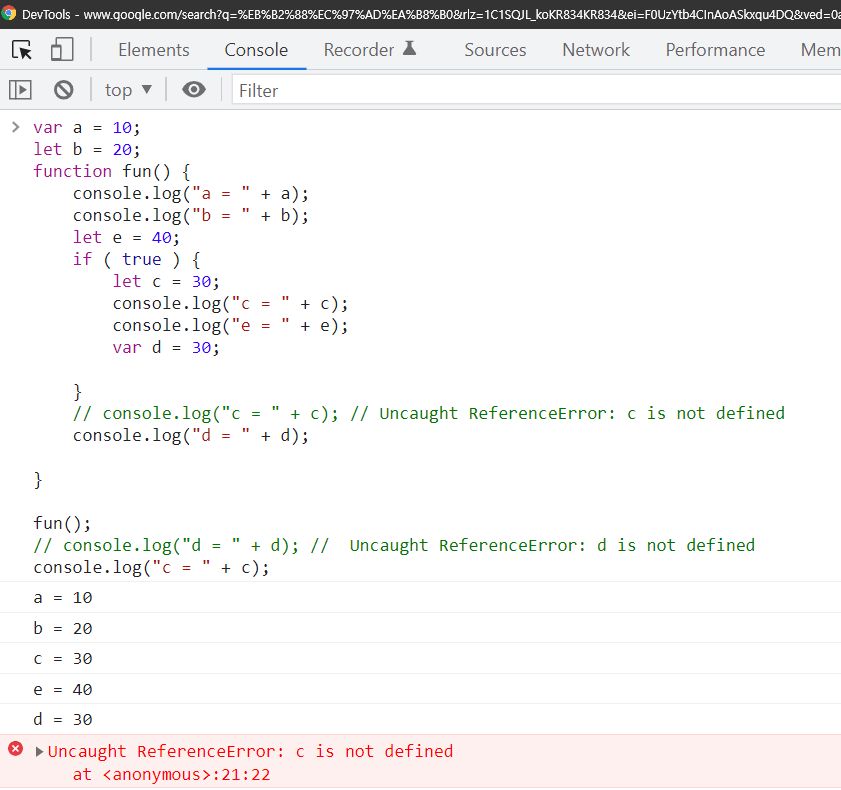 - 함수 fun() 영역의 if 블록 안에 선언된 변수 c, d중 var로 선언된 변수 d는 funtion scope로 함수 안에서는 모두 사용 가능하지만 let으로 선언 된 변수 c는 block scope이므로 if 블럭 안에서만 유효합니다.