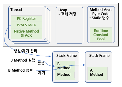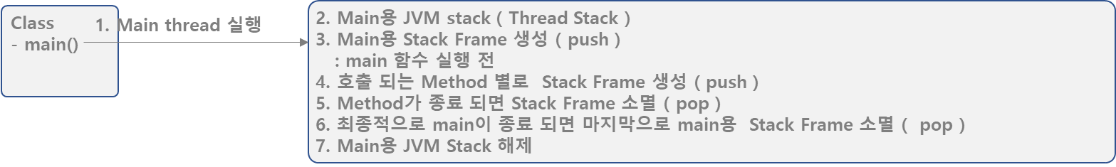 JVM Runtime Data Area - 운영체계로 부터 부여 받은 메모리 영역 - Method Area : : 모든 쓰레드가 공유 하는 영역, JVM이 시작 할 때 생성, 클래스와 인터페이스 Method에 대한 바이트 코드, 전역변수, 런타임 상수 등이 저장 됩니다. -> Main Method가 컴파일 된 Byte Code가 있습니다. - Heap Area : 객체를 저장 할 떄 사용 하는 영역 => 성능 고려 필요 - JVM Stack ( 임시 메모리 ) : 실행 시 Stack Frame이라는 각 쓰레드 마다 하나씩 할당되며 실행되는 메소드의 Stack Frame에는 지역변수, 메소드의 인자, 메소드의 리턴 값, 리턴 번지 등이 저장되고 Stack Frame은 메소드가 끝나면 사라집니다. - Program Counter Register : 쓰레드마다 하나씩 존재 : JVM의 명령어 주소 - Runtime Constant Pool : Method Area에 할당, 상수, 메소드, 필드를 저장하고 자바 프로그램이 참조 할 경우 메모리 주소를 찾아서 참조합니다. - Native Method Stack : 자바 이외의 언어로 작성된 코드를 위한 Stack ( C, C++ 등 )