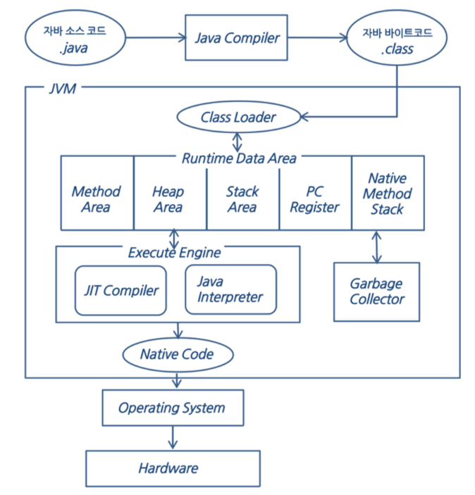 자바 실행과정 - 자바프로그램을 실행하면 JVM의 클래스 로더가 컴파일 된 자바 바이트코드(.class 파일)을 런타임 데이터 영역(Runtime Data Area)의 Method Area에 로드하고 실행 엔진(Execution Engine)이 이를 기계어로 변역 하면서 실행 합니다.