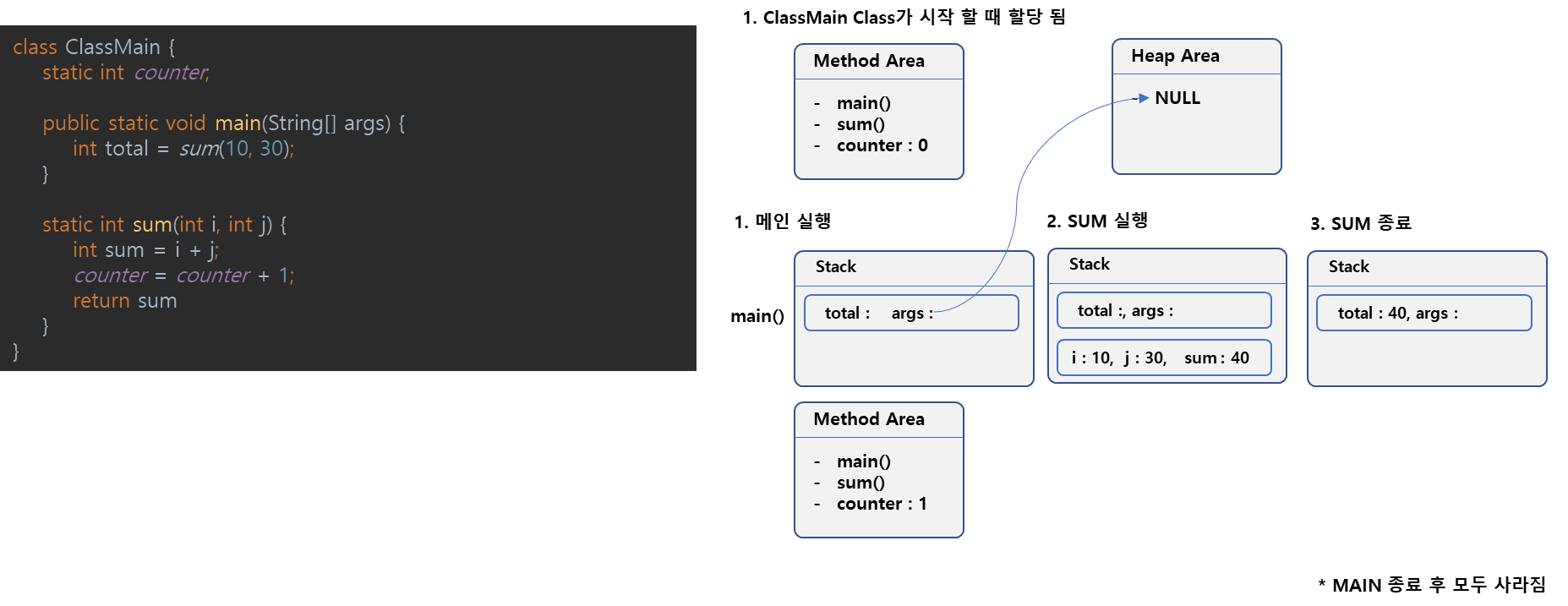 - 메소드 내에서 객체 참조 하면 선언한 변수는 지역변수로 Stack에 위치 하여 Heap에 저장 된객체에 대한 참조 값을 가집니다.