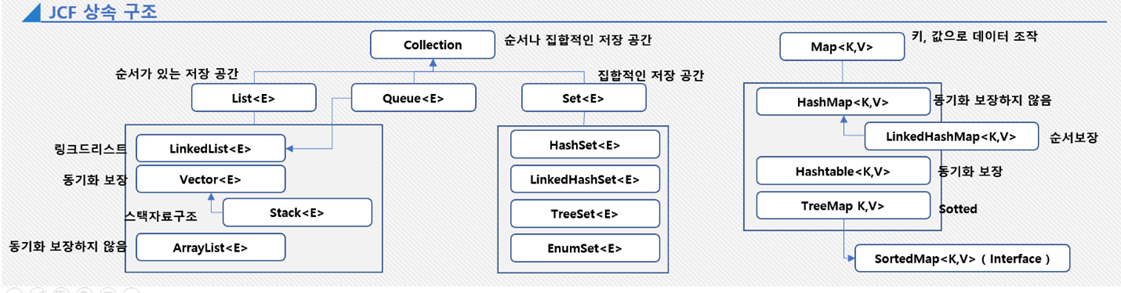 자바 표준 라이브러리 중 컬렉션collection에 있는 ArrayList와 LinkedList는 List 인터페이스를 구현한 것으로 JCFJava Collections Framework의 상속 구조는 다음과 같습니다.