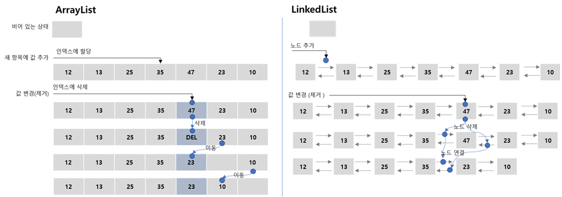 ArrayList는 내부적으로 배열을 사용하여 데이터를 저장하고 삽입/삭제 작업 시 해당 위치 이후의 모든 데이터를 이동하여 삽입/삭제시는 느리지만 데이터를 조회하는 작업에서는 인덱스를 통한 접근을 하여 빠른 성능을 제공합니다. LinkedList는 내부적으로 노드node로 구성이 되어 있어 삽입/삭제 작업 시 해당 노드의 위치만 변경하여 빠르지만 조회 작업 시 모든 노드를 검색하므로 느립니다.